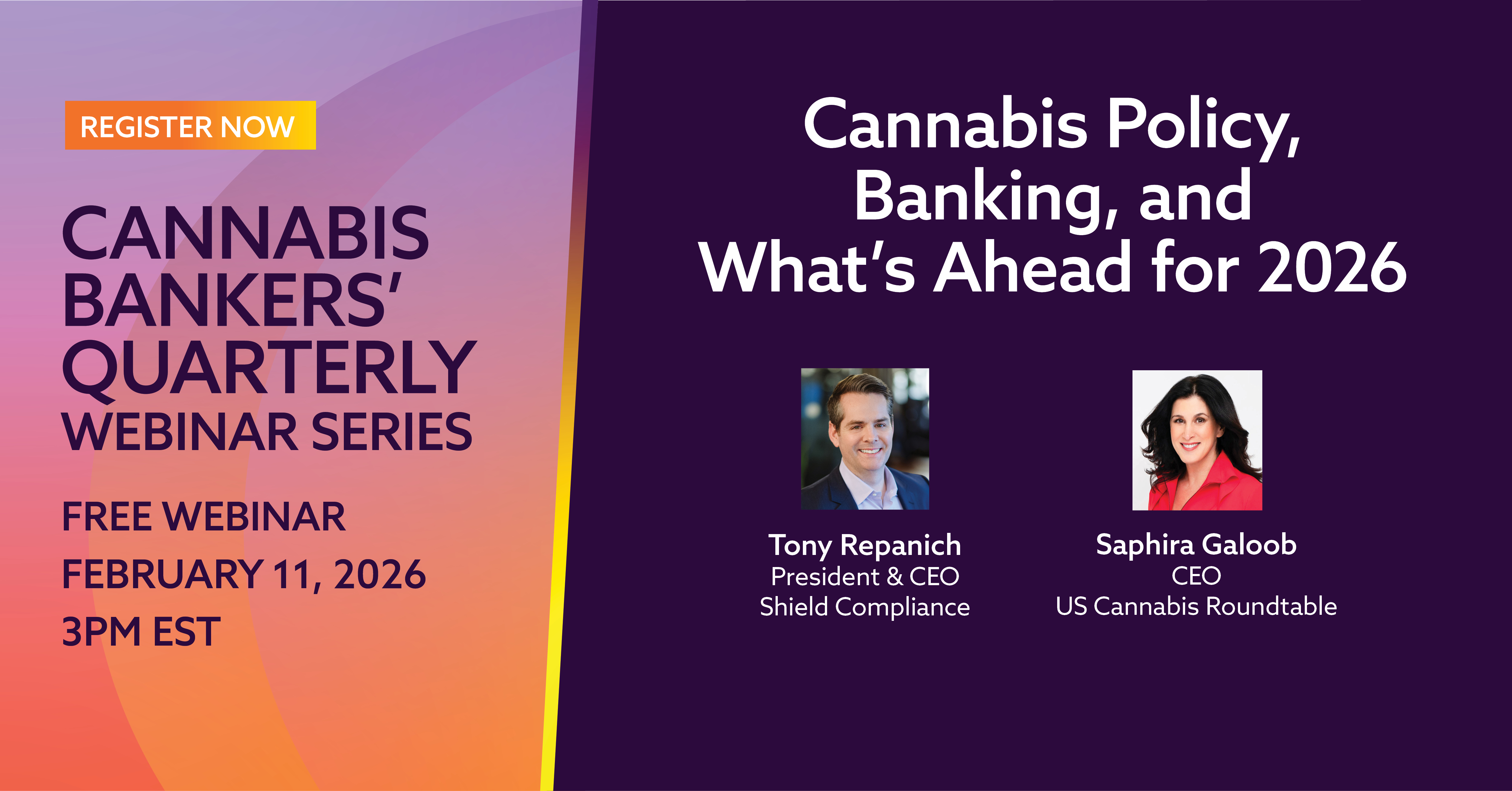 The cannabis industry closed 2025 at a pivotal moment, and 2026 is shaping up to be even more consequential for financial institutions navigating this space. Saphira Galoob, CEO of the U.S. Cannabis Roundtable, will join Tony Repanich, CEO of Shield Compliance, for a timely year-back/look-ahead discussion on the state of cannabis policy in the U.S. The presentation will reflect on the major policy, regulatory, and market developments that defined cannabis in 2025 and explore what lies ahead in 2026, with a particular focus on federal cannabis rescheduling and its implications for banking.